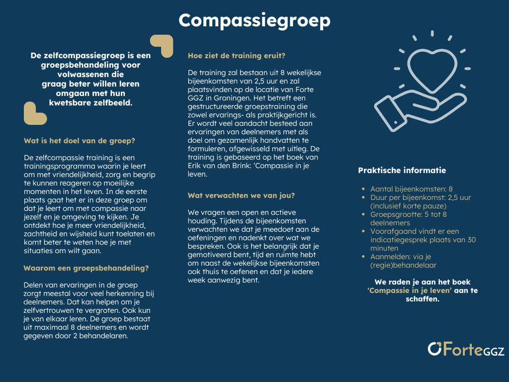 De zelfcompassiegroep is groepsbehandeling voor volwassenen die graag beter willen leren omgaan met hun kwetsbare zelfbeeld.