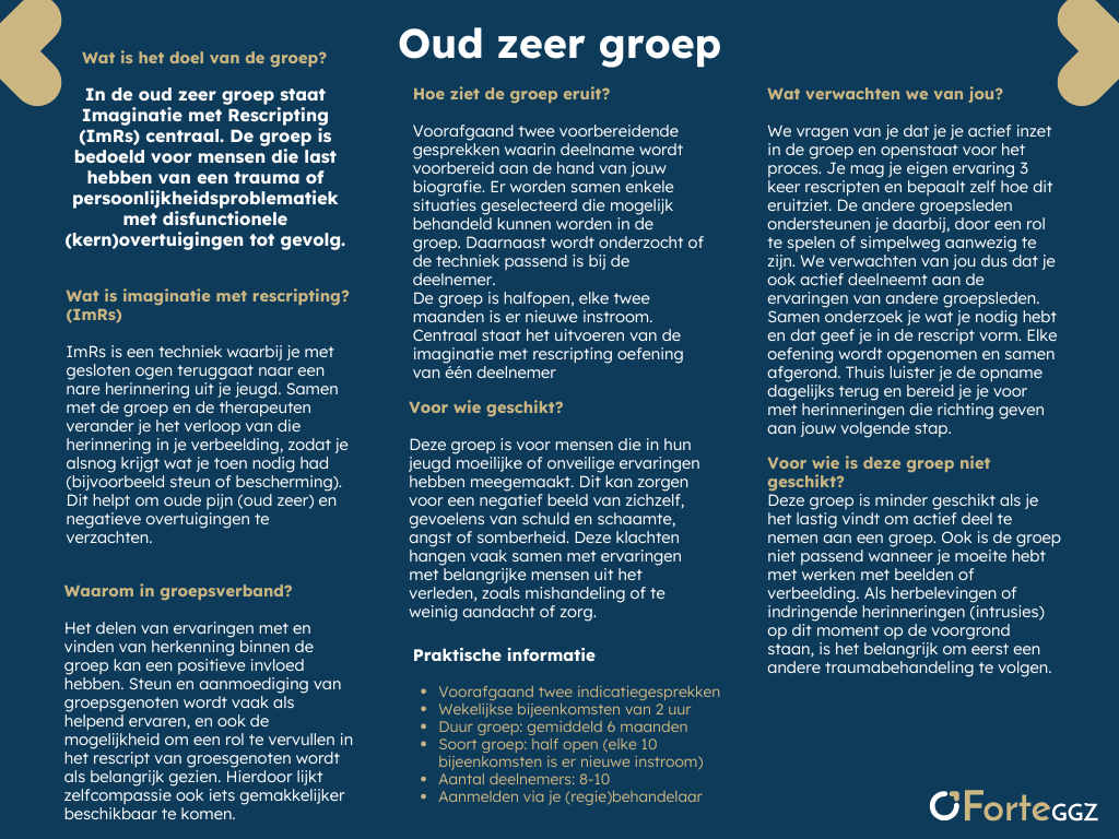 De groep is bedoeld voor mensen die last hebben van trauma of persoonlijkheidsproblematiek met disfunctionele (kern)overtuigingen tot gevolg.